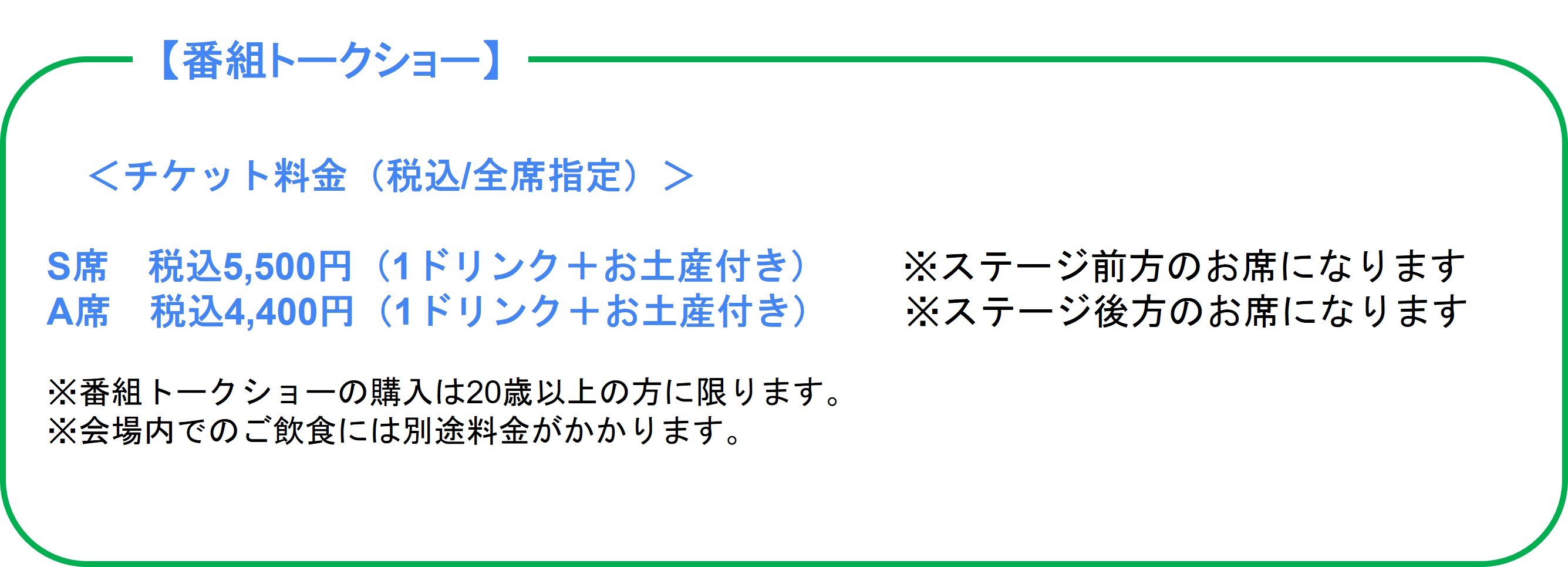 ※【番組トークショー】は全席指定となります。お座席番号はチケット発券後に券面にてご確認ください。お客様でお座席を指定することはできません。